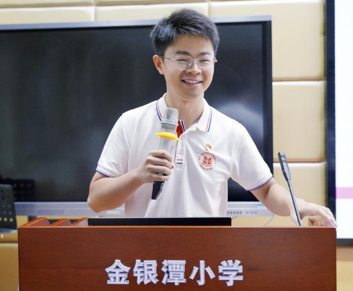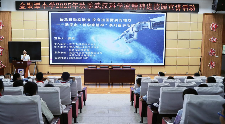 “同学们,你们知道吗?在贵州的深山里,有一口‘大锅’——它直径500米,能装下20多个我们这样的校园。那是‘中国天眼’,是我们倾听宇宙心跳的耳朵。”9月19日下午,在东西湖区金银潭小学悦行楼报告厅内,华中科技大学机械科学与工程学院博士研究生滕钺以《追“星星”的人 传承“科学家精神”,投身祖国需要的地方》为题,用孩子们听得懂的语言,将“中国天眼”FAST和南仁东的故事娓娓道来,为200名小学生打开了一扇通往科学与精神世界的窗口。