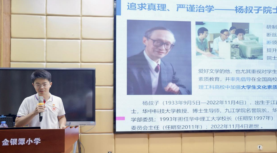 除了南仁东,滕钺还带来了华中科技大学机械学院院士们的故事。当他展示赵学田教授的“长对正、高平齐、宽相等”制图九字诀时,孩子们跟着齐声朗读;讲到段正澄院士“耐得住寂寞,不能外面来一个‘脉冲’自己就‘震荡’”的科研态度时,他特意停下来解释:“就像大家做数学题,要静下心来一步步计算,不能一遇到难题就放弃。”在整个宣讲活动中,孩子们争相举手提问,滕钺一一耐心解答,结尾他真诚地说:“也许你们中就会有人成为天文学家、工程师,去回答这些问题。科学的星空需要更多追星的人,而科学家精神就是指引方向的北极星。”