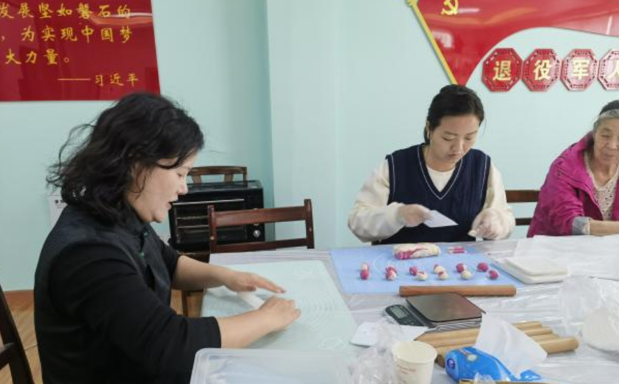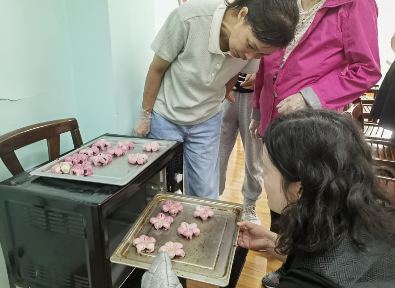 进入制作教学阶段,专业糕点老师通过专业娴熟的“叠、压、卷”技法展示开酥过程,并强调“酥层均匀才能口感酥脆”,再细致演示桃花造型的捏边、雕花技巧,提醒烘焙时的温度与时间把控要点。居民们围坐一起,手持面团认真模仿,遇到开酥断裂、造型不完整等问题时,老师立即上前协助,手把手指导调整。