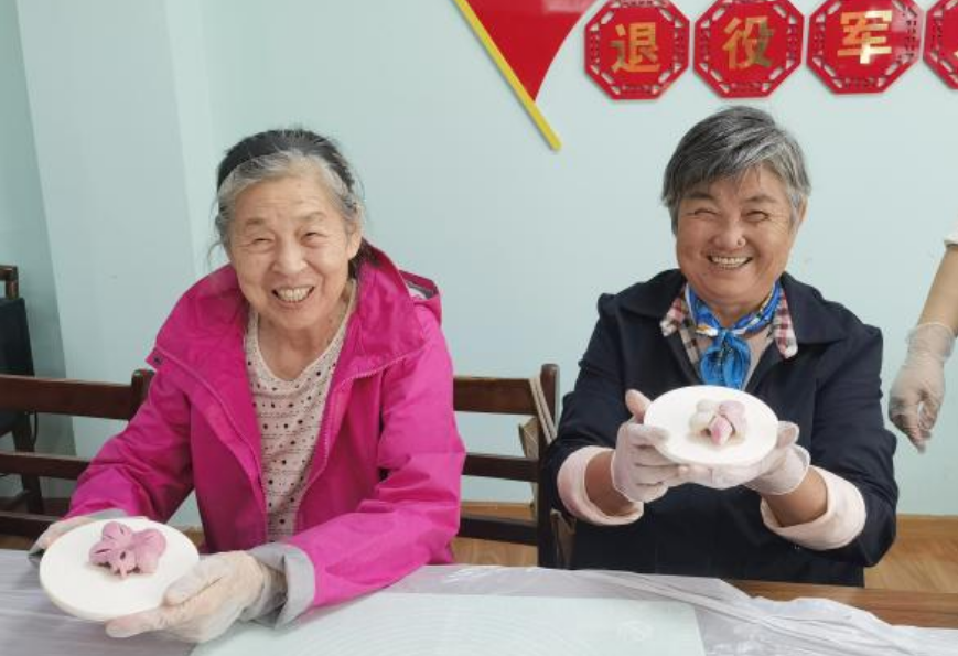 活动尾声,居民们将做好的桃花酥摆放整齐,举起手机拍照打卡,还互相分享制作心得:“原来开酥要这么有耐心, 多亏老师指导!”