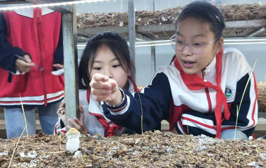 活动以“食用菌产业科普”为核心主线,打造沉浸式研学体验。在企业科技志愿者的带领下,学生们依次走进珍稀食用菌科普展厅、智能出菇房与菌包加工车间,通过“观摩+实践+互动”的模式,直观了解蘑菇的生长条件、营养特性及现代化种植全流程。从亲手操作菌包制作、观察基料发酵,到体验蘑菇采摘,孩子们在动手实践中近距离感受科技赋能农业的独特魅力。“原来蘑菇要在恒湿恒温的房子里生长,亲手做菌包时特别有成就感!”“原来不同蘑菇的营养不一样。”现场学生的真切分享,道出了研学活动带来的新鲜体验与知识收获。
