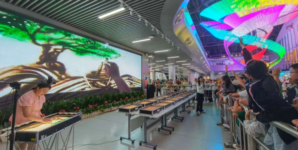 独具匠心的科普沙画Show持续三天。沙画艺术家以沙为墨,以光为纸,在悠扬的乐曲中,将中国墨的千年历程、SIM卡的革新与变迁全新演绎,艺术化地展现了从古至今人类对科技的向往与文化的进步,为观众带来视觉与心灵的双重震撼。此外,沙画Show的玩法升级,单一的金黄色沙画被施以“魔法”,幻变成五彩斑斓的彩色沙画,“食物的色彩”得以完美呈现,观众瞬间感受迎面而来的视觉冲击。参与体验沙画的小观众现场学习绘画天安门、长城、山川河流,写下对祖国母亲76岁生日的祝福。