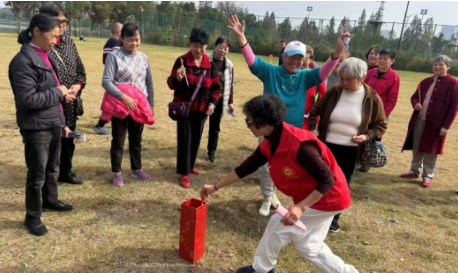 趣味运动环节,社区结合老年人身体特点与科普需求,优化项目设置,推出夹乒乓球、投壶、“科普盲盒” 幸运套圈等兼具趣味性与安全性的项目。夹乒乓球比赛中,老人们全神贯注,动作沉稳;投壶项目前,大家排队跃跃欲试,精准投中者露出孩童般笑容;而 “科普盲盒” 套圈区人气爆棚,盲盒内包含放大镜、便捷读数老花镜、印有健康科普口诀的环保袋等物品,老人们在游戏中收获实用工具与科普知识,感受科普对老年生活的贴心助力,现场始终洋溢着轻松愉悦的氛围。