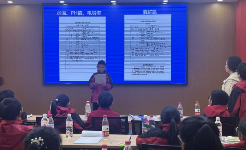 观察结束后,同学们在科学校队肖常威、陈媛园老师的带领下采集了小南湖的湖水,分四个小组,用不同的仪器测试水温、pH值、电导率、溶解氧、浊度等数据。在等待实验数据的间隙,区湖泊管理所工作人员彭潇细心地解答了学生们的问题。“为什么没看到桃花水母?”“因为桃花水母在目前低温状态下进入休眠期了,来年夏天才可能再次出现。”“湖中的小喷泉是为了美观吗?”“那是曝气机,可以形成水雾抛洒在空中,增加水中溶解氧。”“湖边丰富的植物有什么作用?”“植物的根系可以固化泥土,减少大雨时雨水入湖的量。”