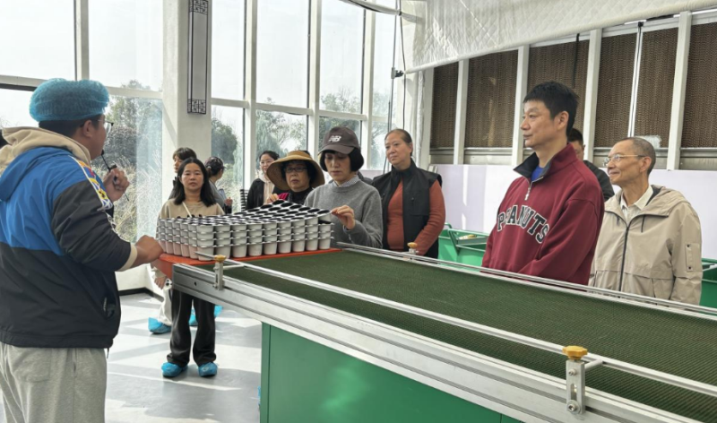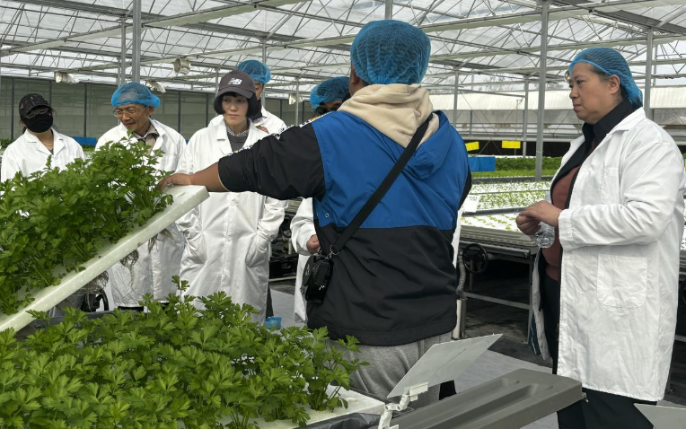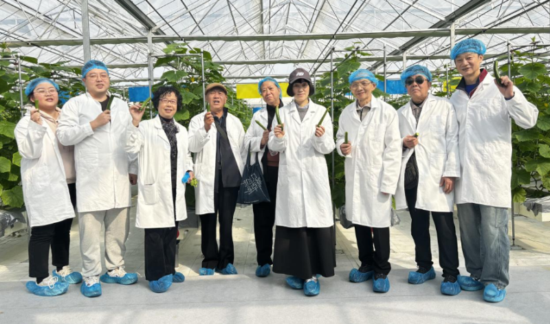 秋日的农业基地,整齐排列的蔬菜大棚里绿意盎然。经过穿鞋套、戴发套、着干净白大褂、风淋系统除尘的“准入”程序,一行人来到蔬菜工厂内,开启沉浸式科技农业探索之旅。“这是什么菜?长得像香菜,但没有那么浓的气味?”“这是香菜和芹菜杂交的小香芹,您可以掐片叶子闻闻。”看着翠绿欲滴的各类蔬菜,在无人大棚里长势喜人,老干部们倍感振奋,拿出手机拍照留念。在工作人员的专业讲解下,众人详细了解了智能温控、无土栽培、物联网监测等先进技术在农业生产中的应用,从种子培育到作物采收的全流程智能化管理,不仅大幅提升了生产效率,更实现了农产品质量的精准把控,让大家深刻感受到科技创新为传统农业带来的颠覆性变革。