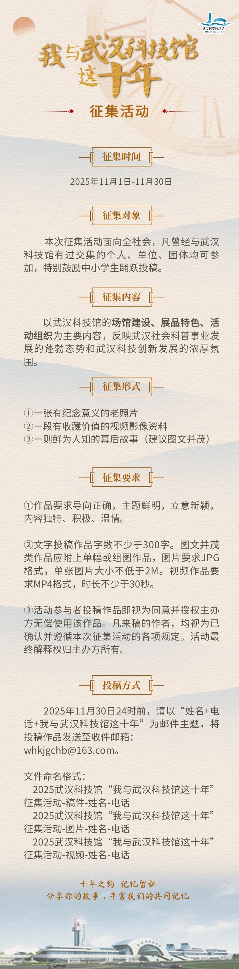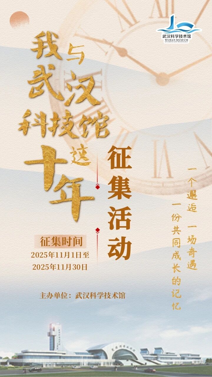 如果你是武汉科技馆的忠实“粉丝”、常驻志愿者、外地参观者或者讲座嘉宾和场馆建设者,并且恰好珍藏着十年间(2015年至2025年)记录武汉科技馆发展变迁的老照片、小视频或故事线索,欢迎积极参与征集活动。