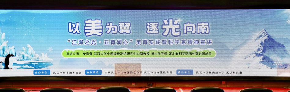 当原创歌曲《少年游》的旋律在报告厅缓缓落幕,一幅幅南极主题画作映入眼帘,12月26日下午,武汉市汉铁高级中学这场“以美为翼 逐光向南”的科学家精神特色宣讲活动,将武汉大学安家春教授的《五星红旗在南极高高飘扬》宣讲,打造成一场融合科学家精神与美育实践的沉浸式盛宴。它打破传统宣讲边界,以武汉大学中国南极测绘研究中心安家春教授的极地科考亲历为轴,将科学家精神,化为一个个有温度、有触感的故事与对话,深深烙刻在近200名高中生心中。
