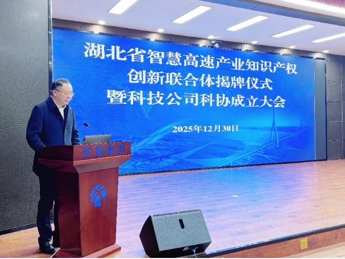 12月30日,湖北省智慧高速产业知识产权创新联合体揭牌仪式暨科技公司科协成立大会在湖北交投科技发展有限公司(以下简称“科技公司”)举行。武汉理工大学法学与人文社会学院院长刘介明,硚口区市场监管局(知识产权局)四级调研员黄斌峰,科技公司党委书记、董事长张再武,党委委员、纪委书记余文鑫,及交投集团、交投科技、武汉理工大学、智慧研究院、葛洲坝交投等联合体单位参加会议。硚口区科协党组书记、主席刘军,副主席佘德孝参加活动。科技公司党委委员、总会计师万家捷主持会议。