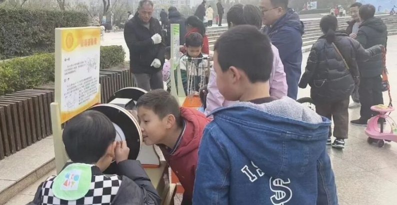 活动现场,广场东侧的科普体验区成了孩子们的乐园。市科技馆安排的科普大篷车带来了针幕、翻转镜像、最速降线、看谁跑得快、懒惰环等十件互动式科普展品,迅速成为“人气王”。孩子们在“看谁跑得快”展台前,亲手释放小球,发现弯曲轨道上的小球竟先到达终点,惊讶不已;在“懒惰环”装置前,他们瞪大眼睛,看着一个金属环缓缓下滑,而另一个却“卡”在轨道上,连连惊呼。