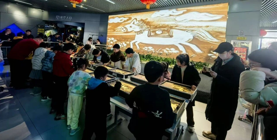 另一侧的沙画秀将光影科技与传统文化结合起来,引发场内外热烈互动。当屏幕上出现专属于2026年的骏马图时,观众争相喊出“马到成功”“一马当先”“万马奔腾”等寓意喜庆吉祥的成语。小朋友们也纷纷体验指尖画马的快乐。