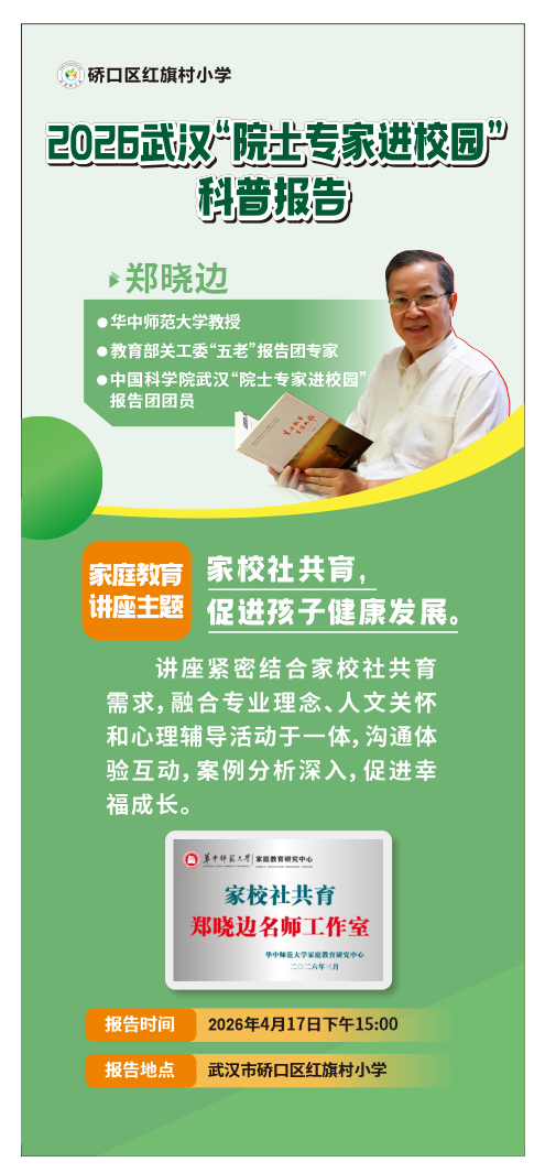 为深入推进家校社协同育人,助力六年级学生身心健康、平稳成长,4月17日,武汉市硚口区红旗村小学成功开展2026武汉市“院士专家进校园”科普报告暨家长学校专题活动。学校特邀华中师范大学郑晓边教授带来以《家校社共育,促进孩子健康发展》为主题的家庭教育科普讲座,六年级家长齐聚校园,共学科学育儿理念,同商孩子成长大计。