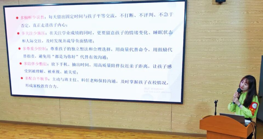 闻主任向家长提出五点建议:多倾听少说教、多关注少施压、多尊重少控制、多陪伴少敷衍、多配合不脱节,呼吁家校同心,科学陪伴孩子健康成长。