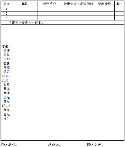 7月5日起至8月份,各区、各单位自行开始组织实施。请各区及各行业、系统、战线单位于7月4日前将测评工作联系人及联系方式报市文明办(测评工作联络信息表见附2)。在测评迎检期间,各测评组织实施部门要坚持天天督查、周周报送、月月排名(每月每类测评对象至少有一次测评排名结果,其中测评对象中排名数量多的仅排前20名、后20名),周三或周五将督查情况及测评结果报市文明办(督查情况及测评结果报送表样式见附3)。
