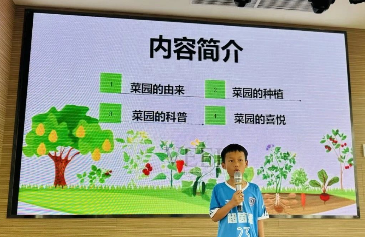 ⼀到六年级的讲解员依次登台,⽤稚嫩的声⾳讲述劳动的喜悦,分享他们的“种植故事”—从嫩芽初绽到硕果累累,每⼀株植物都记录着同学们的汗⽔与智慧。