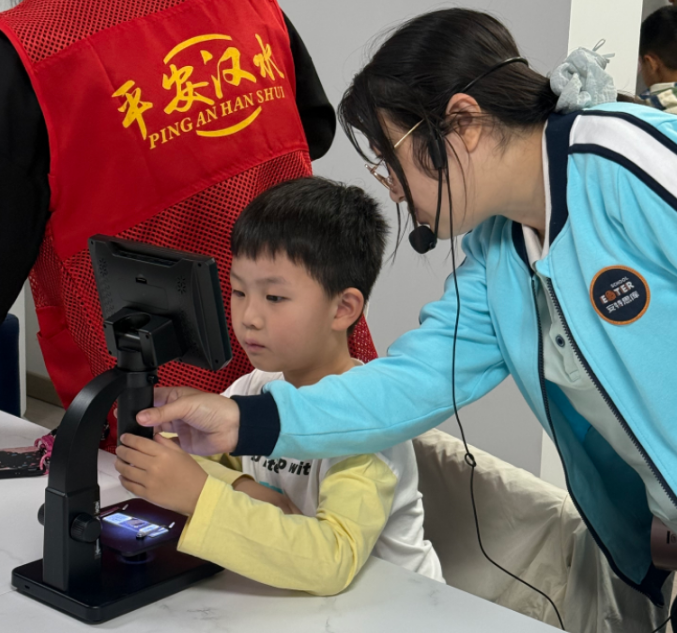 实验室区域,志愿者用PPT讲解显微镜构造与操作步骤,强调“轻拿轻放”等注意事项。随后,孩子分组领取显微镜与载玻片(含细胞、植物导管样本),亲手操作。面对“看不到样本”“植物导管是什么”等疑问,志愿者巡回指导,调整焦距、辨别样本位置,并用“植物导管像家里水管”的比喻解答,孩子们看到微观结构时纷纷惊叹,进一步激发了科学探索兴趣。