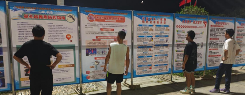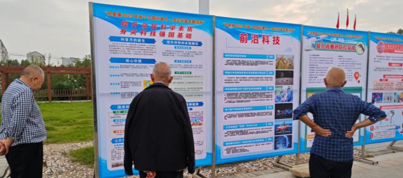 几名中学生,挤在“前沿科技”展板前,对着“嫦娥六号”和“脑机接口”的图片争论不休;而在防灾减灾展板前,带着孩子的母亲指着图片现场教学。不少舞间休息的阿姨凑过来,边擦汗边讨论着关于电动自行车“七个严禁”与新能源汽车的自救方法,几位大爷则对“复粒稻”的研究产生了浓厚兴趣,指着展板就讨论了起来。