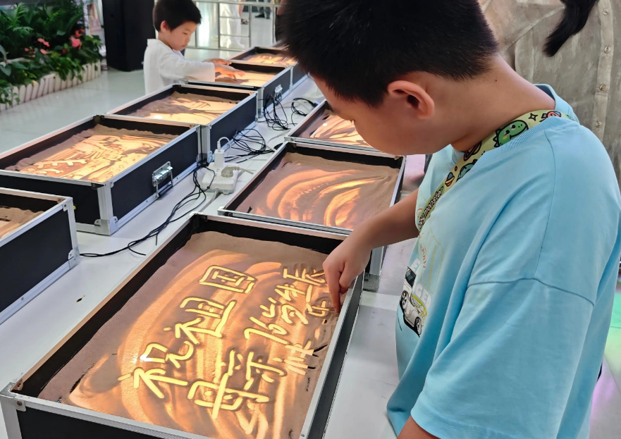 独具匠心的科普沙画Show持续三天。沙画艺术家以沙为墨,以光为纸,在悠扬的乐曲中,将中国墨的千年历程、SIM卡的革新与变迁全新演绎,艺术化地展现了从古至今人类对科技的向往与文化的进步,为观众带来视觉与心灵的双重震撼。此外,沙画Show的玩法升级,单一的金黄色沙画被施以“魔法”,幻变成五彩斑斓的彩色沙画,“食物的色彩”得以完美呈现,观众瞬间感受迎面而来的视觉冲击。参与体验沙画的小观众现场学习绘画天安门、长城、山川河流,写下对祖国母亲76岁生日的祝福。