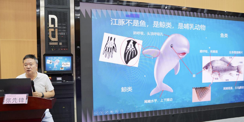 “江豚的‘微笑’,不是因为它真的在笑,而是它天生上扬的嘴角让我们产生了美好的误解——这背后,是它们生存处境的严峻真相。”10月15日晚,在武汉轻工大学金银湖校区励志楼报告厅,中国科学院水生生物研究所研究员张先锋以《江豚和它的朋友圈——长江“十年禁渔”与长江生态保护》为题,用一张张亲手拍摄的江豚照片、一段段跨越千年的详实数据,为300余名大学生揭开了长江水下的生态密码,将科学家精神融入了长江的“微笑”与“坚守”里。