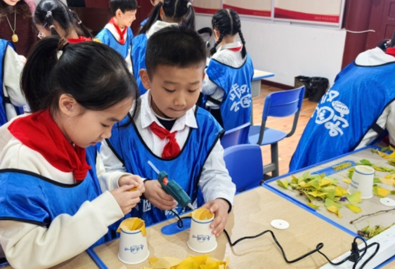 科普环节结束后,手工创作正式开始。在志愿者老师的指导下,同学们将捡拾的银杏叶与纸杯、树枝等材料巧妙结合:以纸杯底部的圆形为基础,将银杏叶层层粘贴,打造出牡丹花瓣的立体层次感;再用纸杯底部做花托,用树枝作花枝,一步步将零散的材料变成一朵朵形态逼真的银杏牡丹。同学们充分发挥想象力,精心摆放、耐心粘贴,现场充满欢声笑语。