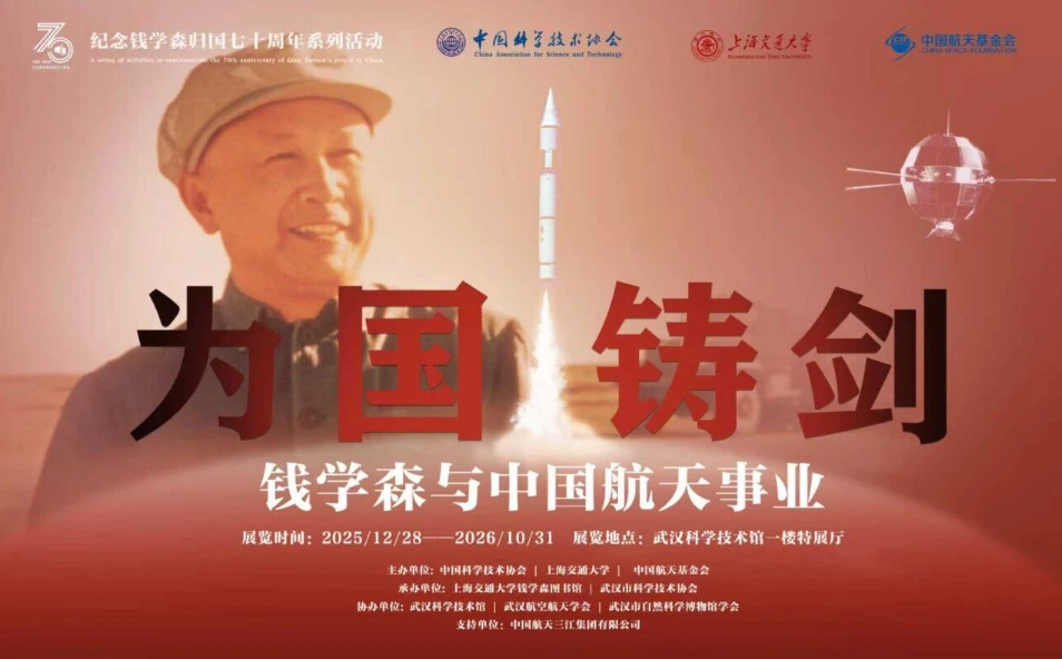 拾光同行十载,科创筑梦未来。武汉科技馆新馆即将迎来开馆十周年!为庆祝这一里程碑,并致敬中国航天事业的伟大先驱钱学森,“为国铸剑——钱学森与中国航天事业”主题展览及系列科普盛宴,将于2025年12月28日盛大开启,诚邀广大公众,特别是青少年朋友们共襄盛举,触摸历史脉动,激荡未来梦想。