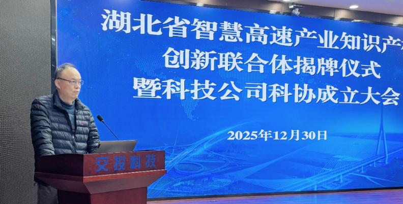 12月30日,湖北省智慧高速产业知识产权创新联合体揭牌仪式暨科技公司科协成立大会在湖北交投科技发展有限公司(以下简称“科技公司”)举行。武汉理工大学法学与人文社会学院院长刘介明,硚口区市场监管局(知识产权局)四级调研员黄斌峰,科技公司党委书记、董事长张再武,党委委员、纪委书记余文鑫,及交投集团、交投科技、武汉理工大学、智慧研究院、葛洲坝交投等联合体单位参加会议。硚口区科协党组书记、主席刘军,副主席佘德孝参加活动。科技公司党委委员、总会计师万家捷主持会议。