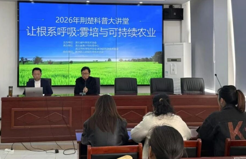 活动特邀新洲区三店街农业技术服务站站长黄慧军主讲,主题为《让根系呼吸:雾培与可持续农业》。授课过程中,黄站长将图文讲解、现场视频演示、实践案例分享融为一体,用通俗语言系统讲解气雾栽培这一现代农业前沿技术。他用“无土种植、喷雾供养、立体种植”三个要点概括雾培核心特点,重点讲解这项技术与传统土培、水培的区别,突出其省水、省肥、省空间、生长更快、产量更高等优势,现场解答大家对无土栽培的疑问,破除认知误区。