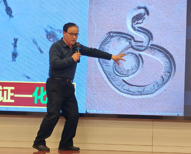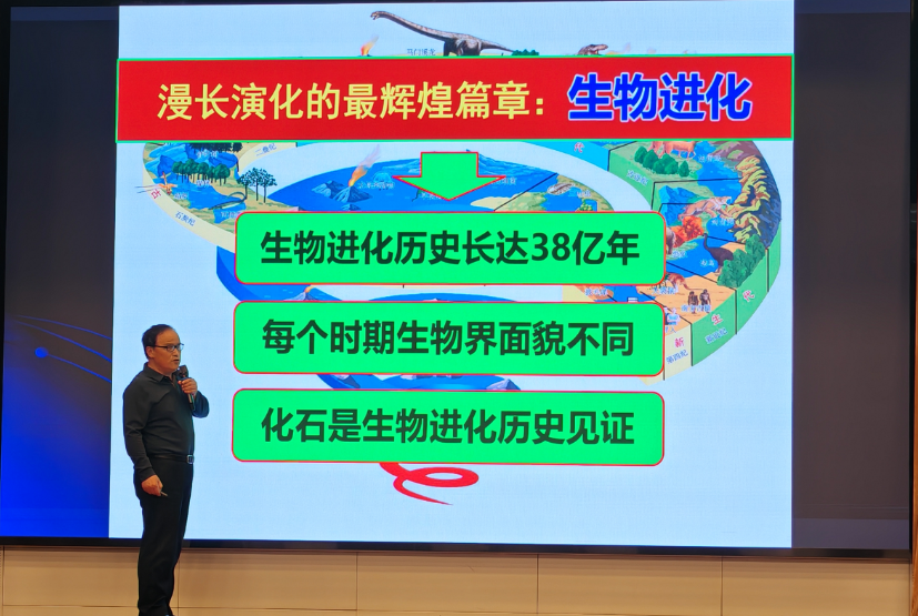 在“漫长演化”部分,徐教授结合地质年代表与真实化石案例,生动讲述生命从38亿年前海洋中的单细胞生物,到寒武纪生命大爆发、植物与脊椎动物先后登陆、恐龙繁盛与灭绝,直至人类出现的完整历程;他用“地球46亿年浓缩为1天” 的形象比喻,让同学们清晰感知人类在地球历史中的短暂与珍贵,还结合板块运动知识,解释青藏高原隆起、中国地势三级阶梯形成等地质奇观,揭秘沧海桑田的变迁奥秘。