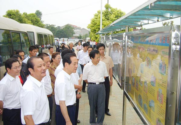 图为全国人大副委员长韩启德(左三)视察武汉市新洲双柳街科普画廊