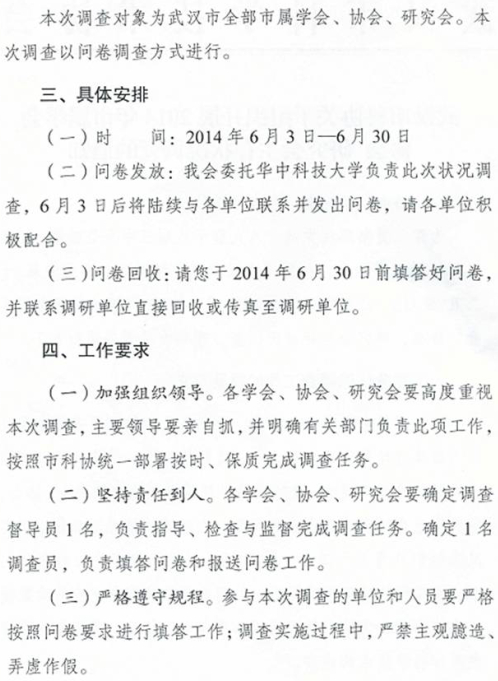武汉市科协关于组织开展2014年市属学会 、协会、研究会生存状况调查的通知