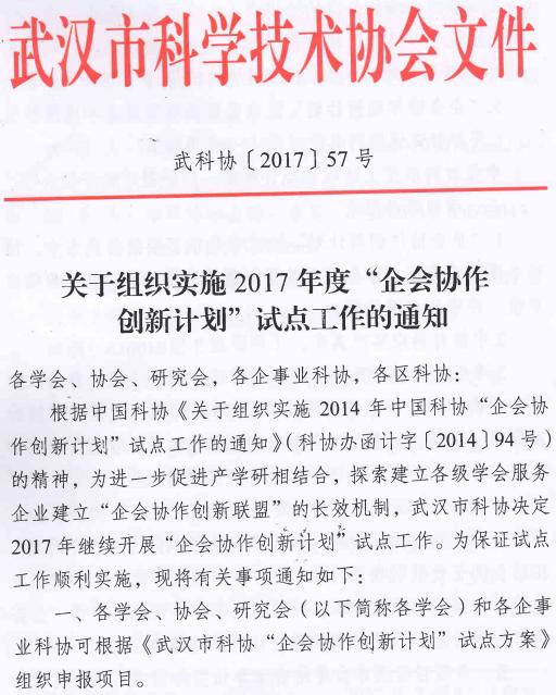 附件: 1、武汉市科协“企会协作创新计划”试点方案