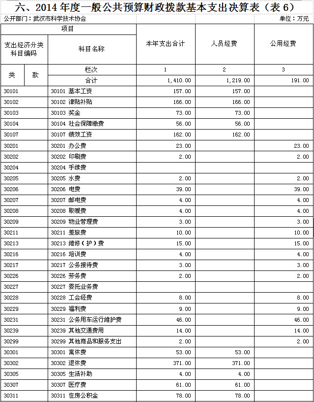 武汉市科学技术协会2014度一般公共预算财政拨款基本支出1,410万元,其中,人员经费1,219万元,主要包括:基本工资、津贴补贴、奖金、社会保障缴费、伙食补助费、绩效工资、其他工资福利支出、离休费、退休费、抚恤金、生活补助、医疗费、住房公积金、提租补贴、购房补贴、其他对个人和家庭的补助支出;公用经费191万元,主要包括:办公费、印刷费、咨询费、手续费、水费、电费、邮电费、取暖费、物业管理费、差旅费、因公出国(境)费、租赁费、会议费、培训费、公务接待费、劳务费、委托业务费、工会经费、福利费、公务用车运行维护费、其他交通费用、办公设备购置、其他资本性支出。