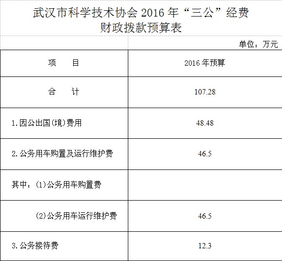 武汉市科学技术协会2016年“三公”经费 财政拨款预算表