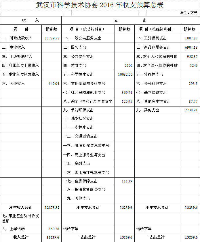武汉市科学技术协会2016年收支预算总表