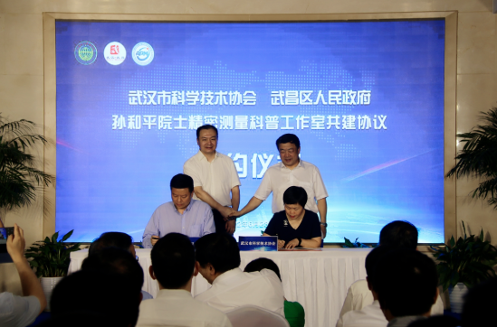 市科协副主席郑华、武昌区人民政府副区长王飞签署院士精密测量科普工作室共建协议,武昌区区委书记余松、武汉市科协党组书记、副主席陈光勇见签。