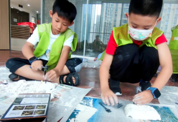 在了解恐龙及化石的相关知识后,老师拿出了今天要带同学们探索的恐龙材料包,大家看到后都十分兴奋,非常期待能挖出一个特殊的恐龙,在老师讲解完详注意事项后,便迫不及待的开始挖起了化石。最后拿着自己组装好的恐龙化石开心的笑了起来。