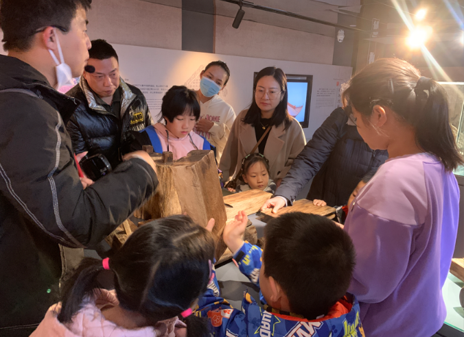 木构造建筑离不开各种刨木工具,展厅里整面木作工具墙吸引了孩子们的目光。石器时代出土的刀、斧、石锯等,均可以用来加工木材,进入金属器大量使用的时代后,随着技术进步以及木材加工需求的复杂化,木作工具也不断发展细化,形成了多种多样的类型。“我在科学课用过这个工具,比它小很多,是锯木头的”,孩子指着墙上的解木工具代表框锯兴奋不已。除此之外,还有用于平木的各种槽铇、用于穿剔的凿和用于测量与定向的工具。经过深入浅出、幽默风趣的科普,孩子们明白了榫卯的制作方式。