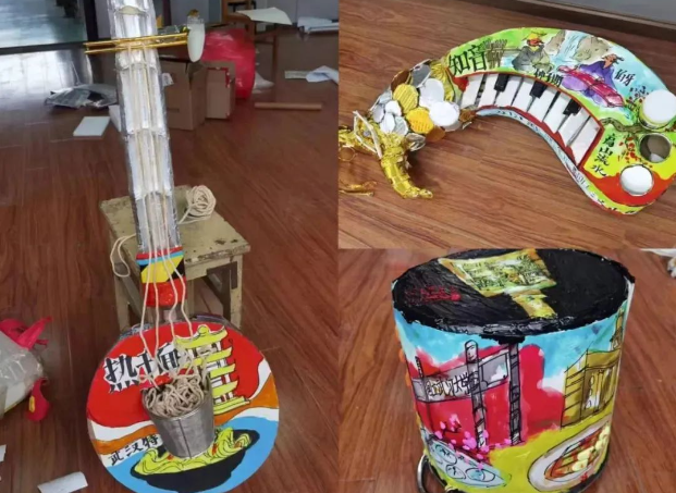 “武汉十大魅力教师”之一的邹华章老师担任团队的美术指导,他带领学校美术社团,将天马行空般的想象力淋漓尽致地展现在大大小小的道具中:热干面吉他、九头鸟键盘、人文武汉架子鼓、星际穿越幕布、欢喜坨头饰……废弃的黏土、纸箱等各种材料在他的巧手下摇身一变,成为一件件风格强烈、令人过目不忘的艺术品;他将武汉的标志性建筑黄鹤楼、长江大桥等,融入到乐器等道具的细节的设计中,展现出武汉的城市风貌和人文底蕴,为表演风格增光添彩。